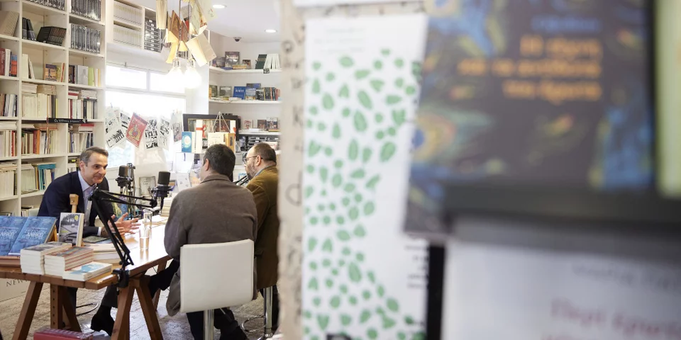 Είμαστε εδώ σε ένα πολύ φιλόξενο βιβλιοπωλείο, έναν πολύ αγαπητό και οικείο χώρο του Πρωθυπουργού. Μαζί οι τρεις μας, Κώστας Μοστράτος, Φίλιππος Παππάς και φυσικά Κυριάκος Μητσοτάκης, να μας πει ο Πρωθυπουργός για τη σχέση του, λοιπόν, με το βιβλίο.
