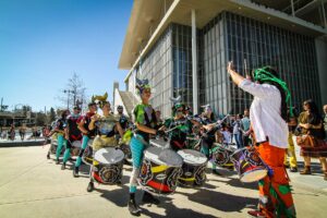 Αρχικά, η πολυπολιτισμική μπάντα κρουστών Bloco Swingueira μεταφέρει την