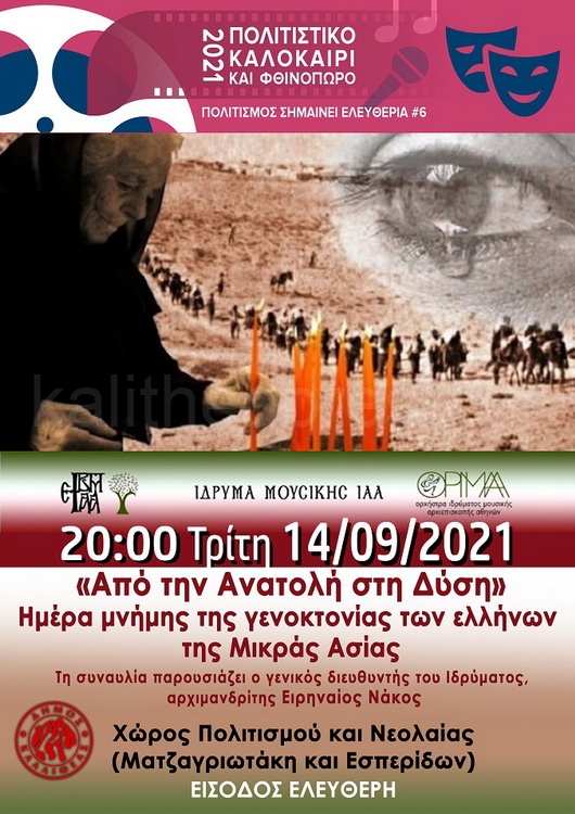Στις 20:00 Χώρος Πολιτισμού και Νεολαίας (Ματζαγριωτάκη και Εσπερίδων) «Από την Ανατολή στη Δύση» Ημέρα μνήμης της γενοκτονίας των Ελλήνων της Μικράς Ασίας