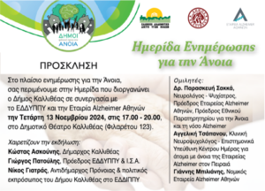 Ημερίδα ενημέρωσης για τις εξελίξεις στην άνοια, τη μάστιγα της εποχής μας, θα πραγματοποιήσει ο Δήμος Καλλιθέας την Τετάρτη 13 Νοέμβριου 2024, ώρα 17.00 – 20.00, στο Δημοτικό θέατρο Καλλιθέας (Φιλαρέτου 123).