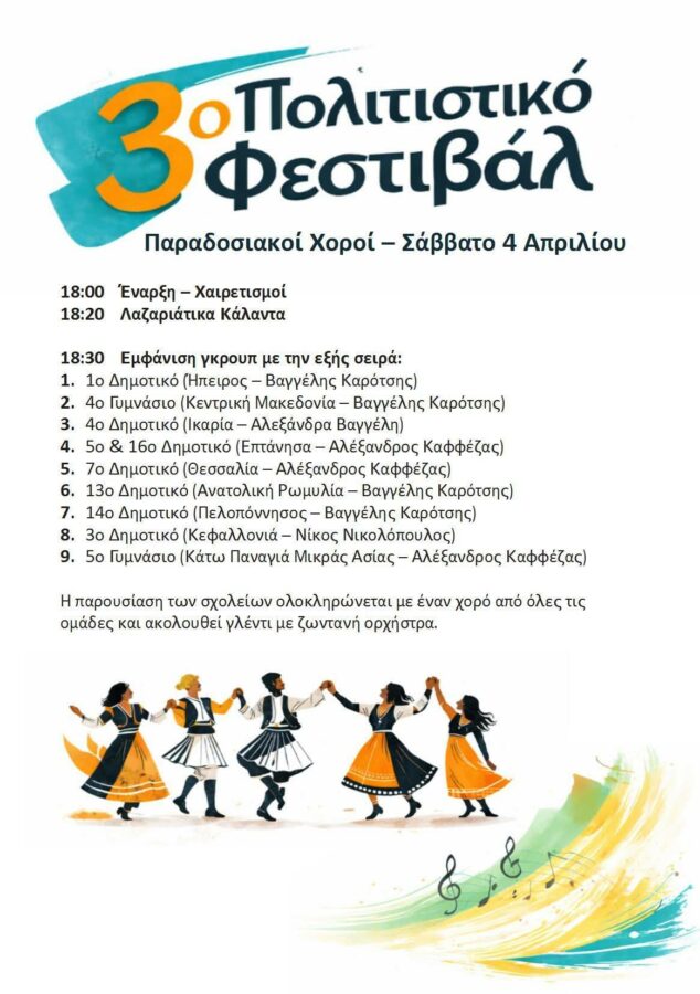 - Σάββατο 4 Απριλίου: Η πρώτη ημέρα του φεστιβάλ θα είναι αφιερωμένη στους παραδοσιακούς χορούς, με ζωντανό γλέντι για όλους τους συμμετέχοντες. Μαθητές και εκπαιδευτικοί θα παρουσιάσουν δρώμενα εμπνευσμένα από την ελληνική παράδοση, ενώ η μουσική θα συνοδεύει κάθε στιγμή της εκδήλωσης.