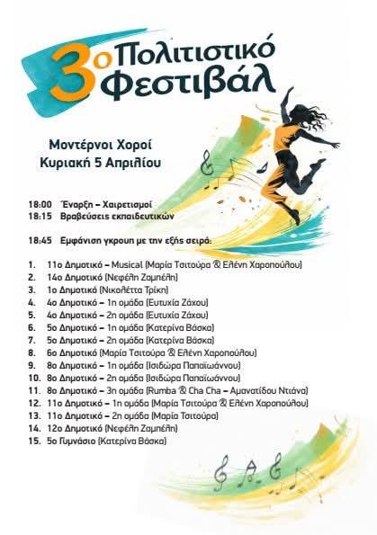 - Κυριακή 5 Απριλίου: Η δεύτερη ημέρα θα επικεντρωθεί στους μοντέρνους χορούς και θα περιλαμβάνει τις βραβεύσεις των εκπαιδευτικών που διακρίνονται για την προσφορά τους στην εκπαίδευση και την καλλιτεχνική ανάπτυξη των μαθητών. Το πρόγραμμα περιλαμβάνει επίσης δημιουργικές δραστηριότητες για τα παιδιά και τους επισκέπτες.
