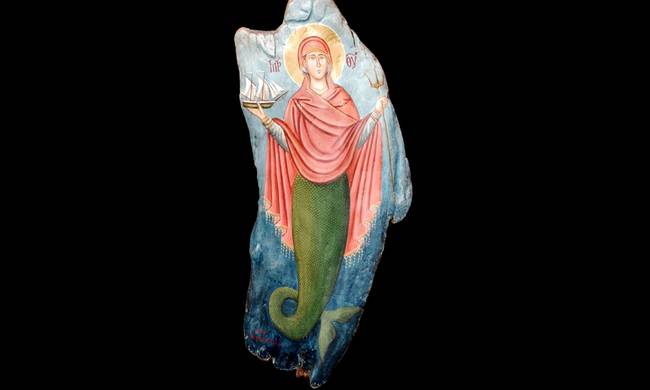 Παναγιά Γοργόνα, μισή γυναίκα –μισή ψάρι και ,ναι , η όλη ιστορία υπήρξε η πηγή έμπνευσης του Στράτη Μυριβήλη για το τρίτο και τελευταίο του μυθιστόρημα «Παναγιά Γοργόνα»/1948. Είχε δεί ή όχι ο αγιογράφος της γοργόνας-Παναγίας στην πραγματικότητα