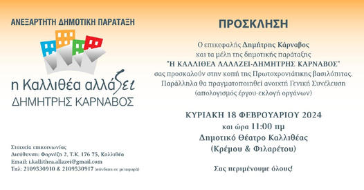 Η Δημοτική παράταξη Η ΚΑΛΛΙΘΕΑ ΑΛΛΑΖΕΙ του πρ.Δημάρχου Καλλιθέας Δημήτρη Κάρναβου θα πραγματοποιήσει την κοπή της Βασιλόπιτας και ανοιχτή Γενική Συνέλευση με εκλογή οργάνων (Γραμματεα & μελών ) της Εκτελεστικής Επιτροπής. Κυριακή 18 Φεβρουαρίουστις 11.00 στο Δημοτικό θέατρο Καλλίθέας Κρέμου&Φιλαρέτου