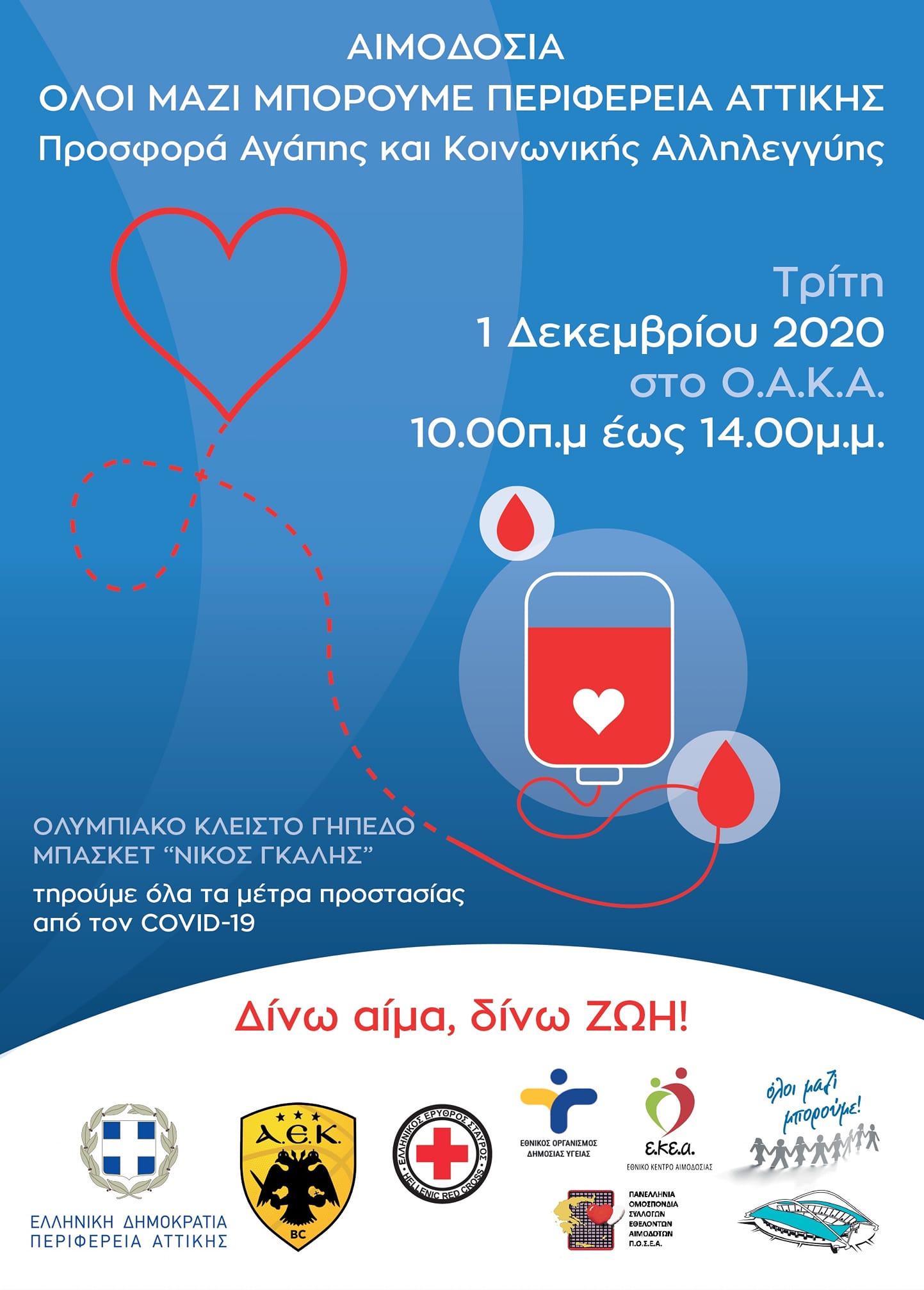Η Περιφέρεια Αττικής σε συνεργασία με το «Όλοι Μαζί Μπορούμε», τον Ελληνικό Ερυθρό Σταυρό, το Αθλητικό Κέντρο ΟΑΚΑ, την ΠΟΣΕΑ και με την στήριξη της ΚΑΕ ΑΕΚ, διοργανώνουν εθελοντική αιμοδοσία.
