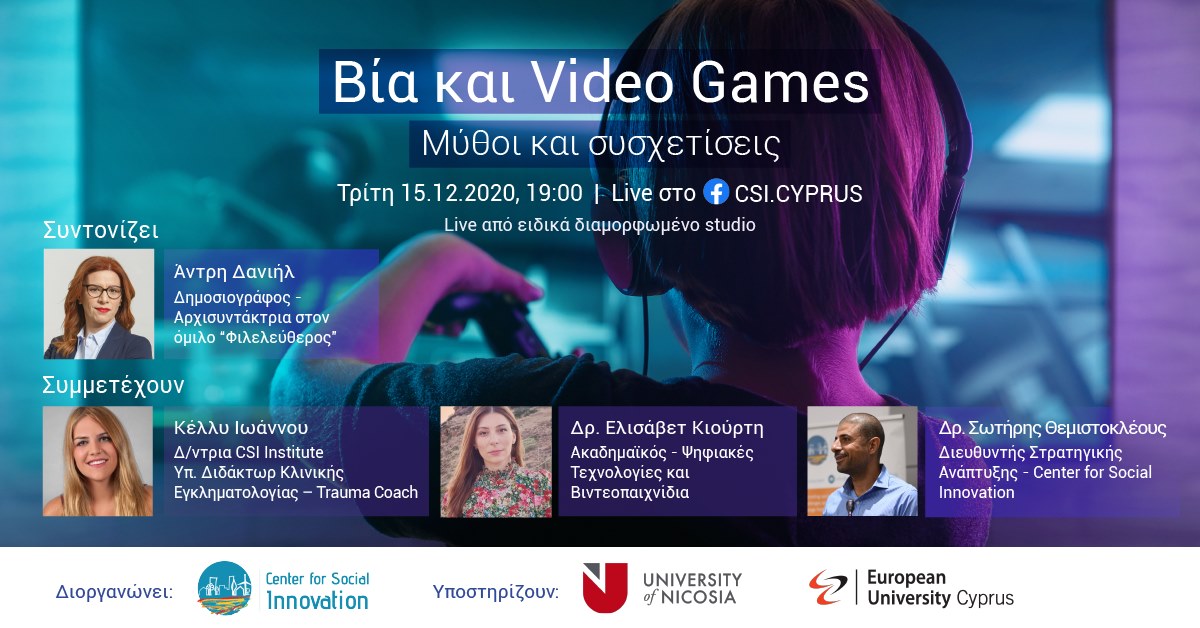 Ποιες είναι οι πρακτικές συμβουλές προς γονείς, εκπαιδευτικούς και παιδιά για μία υγιή χρήση και σχέση με τα ψηφιακά παιχνίδια; Το Center for Social Innovation (CSI) προσκαλεί εξειδικευμένους επιστήμονες σε ένα τραπέζι διαλόγου με αφορμή το πρόσφατο τραγικό συμβάν στη Λεμεσό. Η συζήτηση θα μεταδοθεί ζωντανά την Τρίτη 15.12, στις 19.00 από ειδικά διαμορφωμένο studio.Συμμετέχουν:– Κέλλυ Ιωάννου, Διευθύντρια του Διεθνούς Ινστιτούτου Κυβερνοασφάλειας, Υπ. Διδάκτωρ Κλινικής Εγκληματολογίας – Trauma Coach