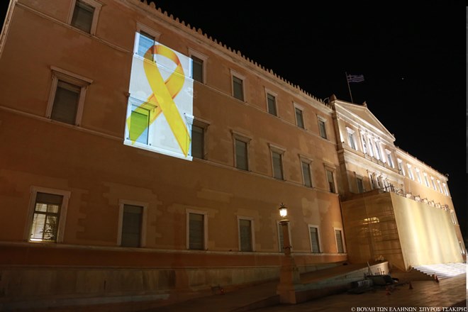 Η Βουλή των Ελλήνων συμμετέχοντας στις εκδηλώσεις που πραγματοποιούνται στο πλαίσιο του «Παγκόσμιου Μήνα Ευαισθητοποίησης για τον Καρκίνο στην Παιδική και Εφηβική ηλικία», φώτισε χθες βράδυ την πρόσοψη του κτιρίου του Κοινοβουλίου με τη «χρυσή κορδέλα» (Golden ribbon), που αποτελεί το σύμβολο της μάχης κατά του καρκίνου στα παιδιά και τους εφήβους. Κάθε χρόνο, παγκοσμίως, διαγιγνώσκονται περισσότερα από 300.000 παιδιά με καρκίνο, ενώ στην Ελλάδα νοσούν ετησίως 350 παιδιά.