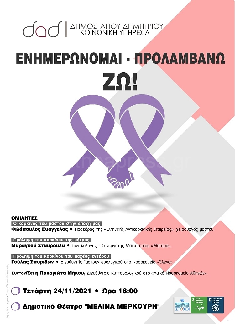 Μια ιδιαίτερη ημερίδα για τη σωστή και εις βάθος ενημέρωση για τρεις μορφές καρκίνου που ταλανίζουν τη σύγχρονη κοινωνία, θα πραγματοποιηθεί την Τετάρτη 24-11-2021 και ώρα 18:00 στο Δημοτικό Θέατρο “Μελίνα Μερκούρη”, υπό την αιγίδα της Επιτροπής Υγείας.