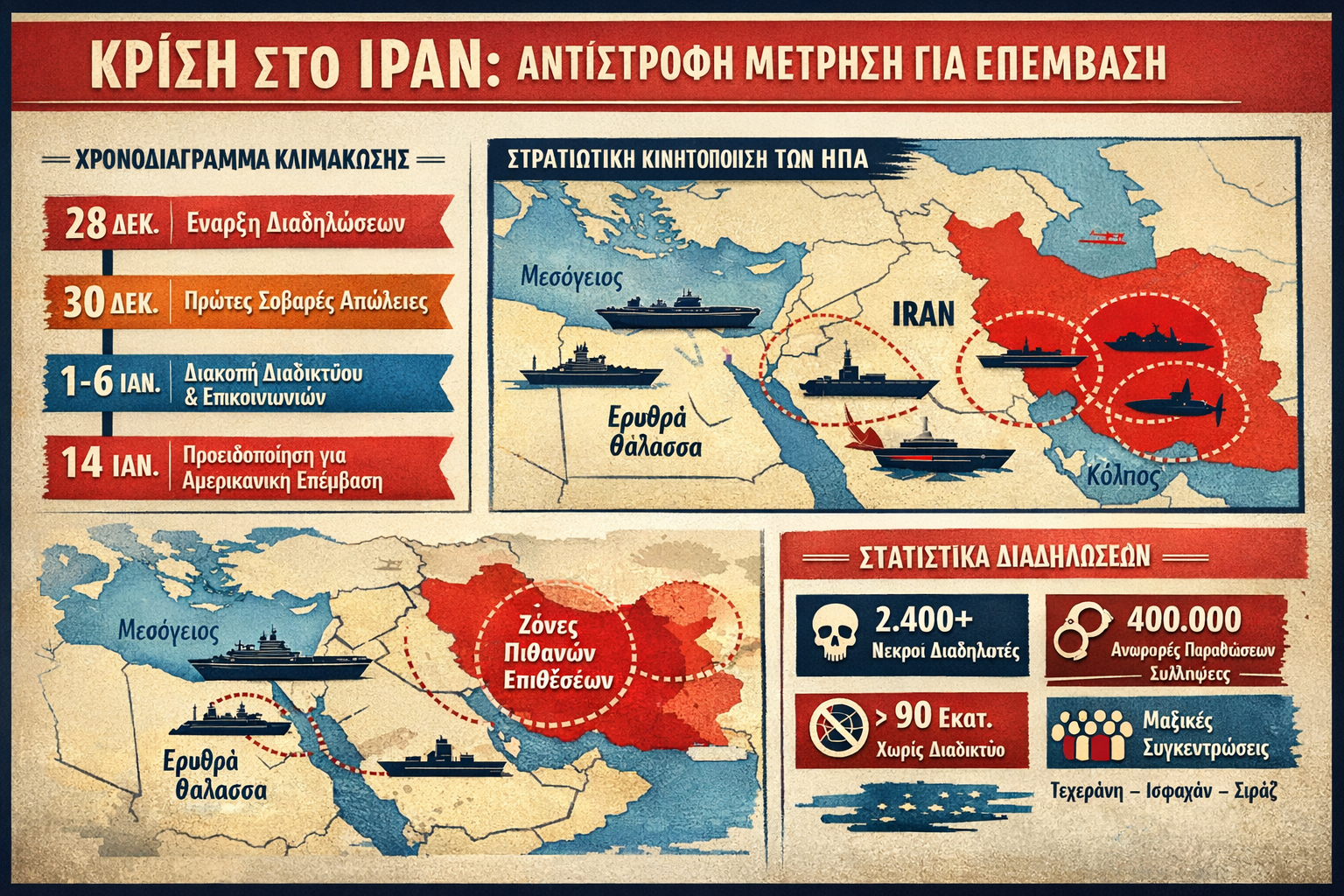 Η κατάσταση στο Ιράν συνεχίζει να κλιμακώνεται, καθώς η κυβέρνηση στην Τεχεράνη προειδοποιεί για ενδεχόμενη αμερικανική στρατιωτική επέμβαση εντός 24 ωρών, ενώ οι διαδηλώσεις στο εσωτερικό της χώρας έχουν προκαλέσει σοβαρές απώλειες και διακοπή επικοινωνιών.