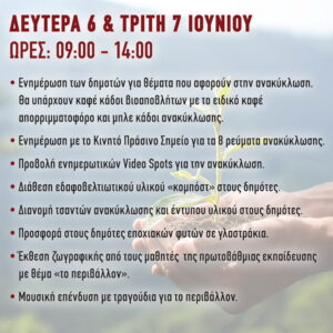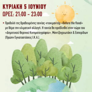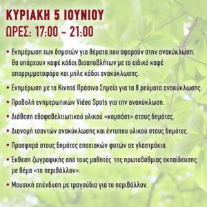 Οι εκδηλώσεις ξεκινούν την Κυριακή 5 Ιουνίου η οποία είναι και η Παγκόσμια Ημέρα Περιβάλλοντος και θα ολοκληρωθούν