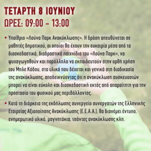 την Τετάρτη 8 Ιούνιου 2022, όπου η Πλατεία Δαβάκη μετατρέπεται σε Υπαίθριο «Λούνα Πάρκ Ανακύκλωσης», με στόχο οι μαθητές δημοτικού, μέσα από τα διασκεδαστικά, διαδραστικά παιχνίδια και τις εκπαιδευτικές, βιωματικές δραστηριότητες, να εξοικειωθούν με τη διαδικασία της ανακύκλωσης και να αποκτήσουν περιβαλλοντική συνείδηση.