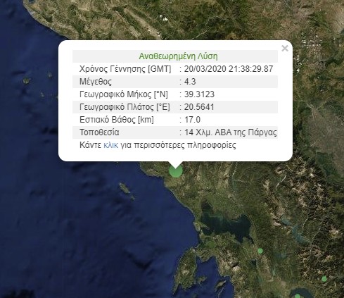Αναστάτωση προκάλεσαν στους κατοίκους της Ηπείρου αργά το βράδυ της Παρασκευής ΣΕΙΣΜΙΚΕΣ ΔΟΝΗΣΕΙΣ. Σύμφωνα με την μέτρηση του Γεωδυναμικού Ινστιτούτου του Εθνικού Αστεροσκοπείου Αθηνών οι σεισμοί σημειώθηκαν αρχικά στις 23:38 το βράδυ της Παρασκευής και είχε ένταση 4.3 βαθμούς της κλίμακας Ρίχτερ. Το επίκεντρο του σεισμού εντοπίστηκε 14χλμ βορειοανατολικά της Πάργας ενώ το εστιακό βάθος υπολογίζεται στα 17χλμ και έπειτα στις 02.49 σεισμική δόνηση μεγέθους 5,6 R 14 χιλιόμετρα ΑΒΑ της Πάργας.