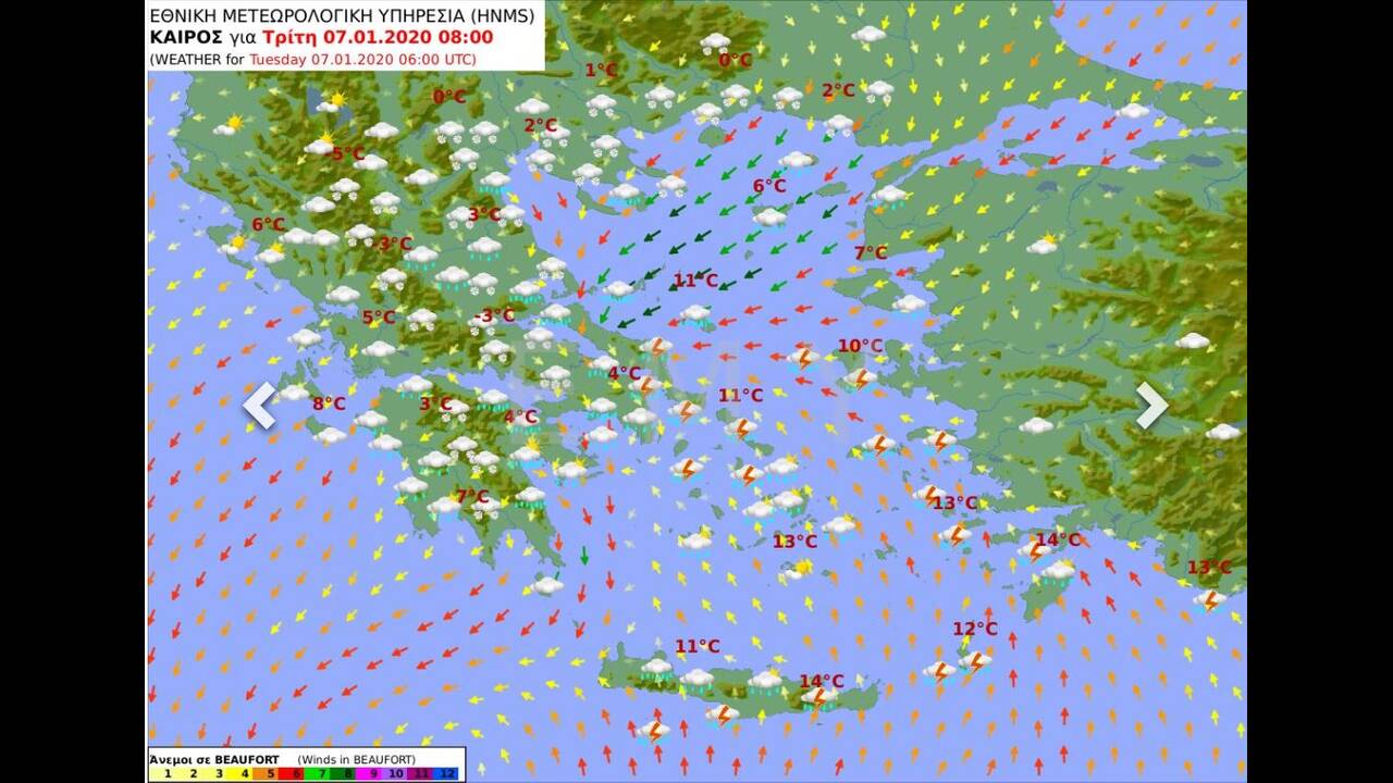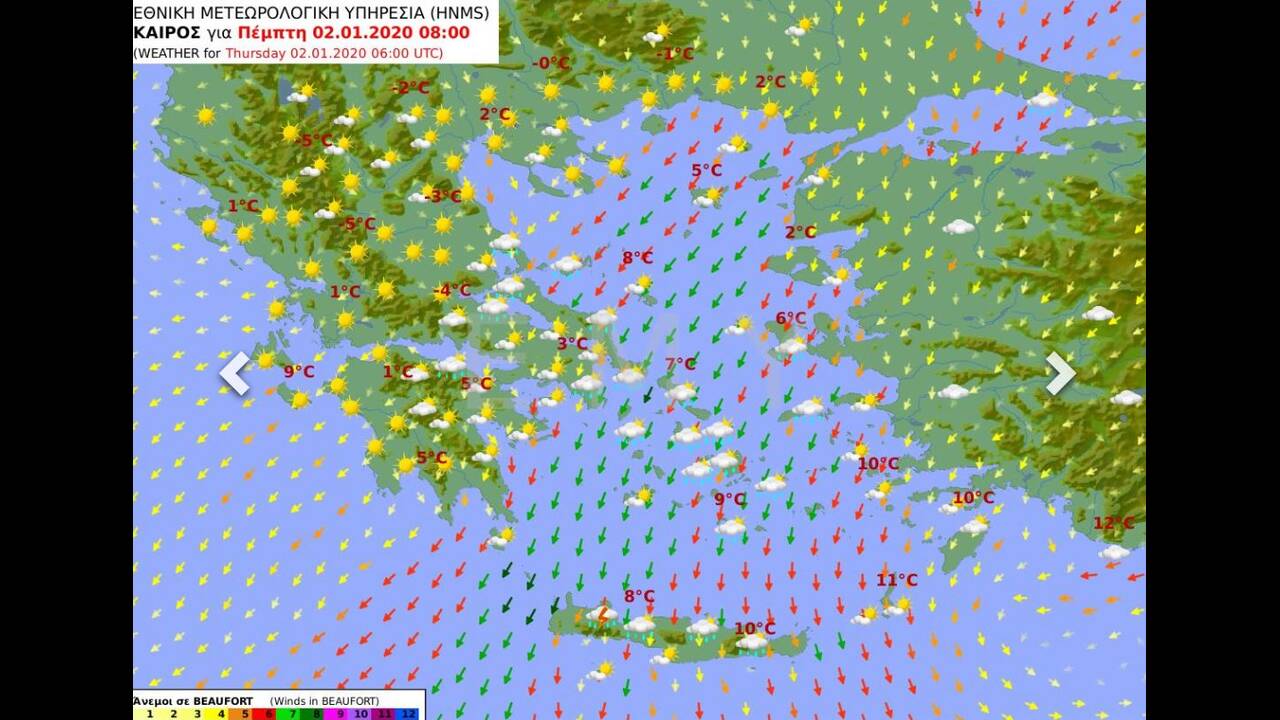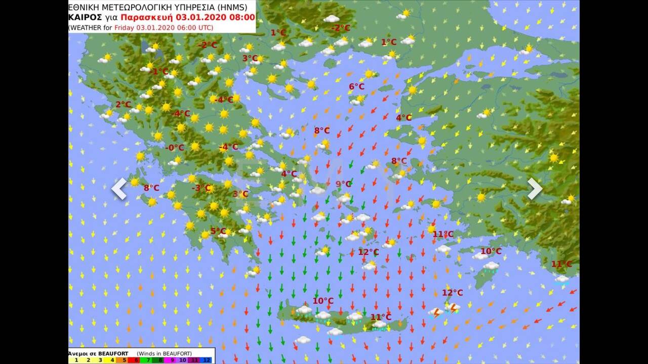 Οι άνεμοι θα πνέουν βόρειοι βορειοανατολικοί 5 με 7, στο Αιγαίο 8 και τοπικά 9 μποφόρ. Βαθμιαία εξασθένηση από τις βραδινές ώρες και από τα βόρεια, ενώ η θερμοκρασία θα κυμανθεί σε χαμηλά επίπεδα.
