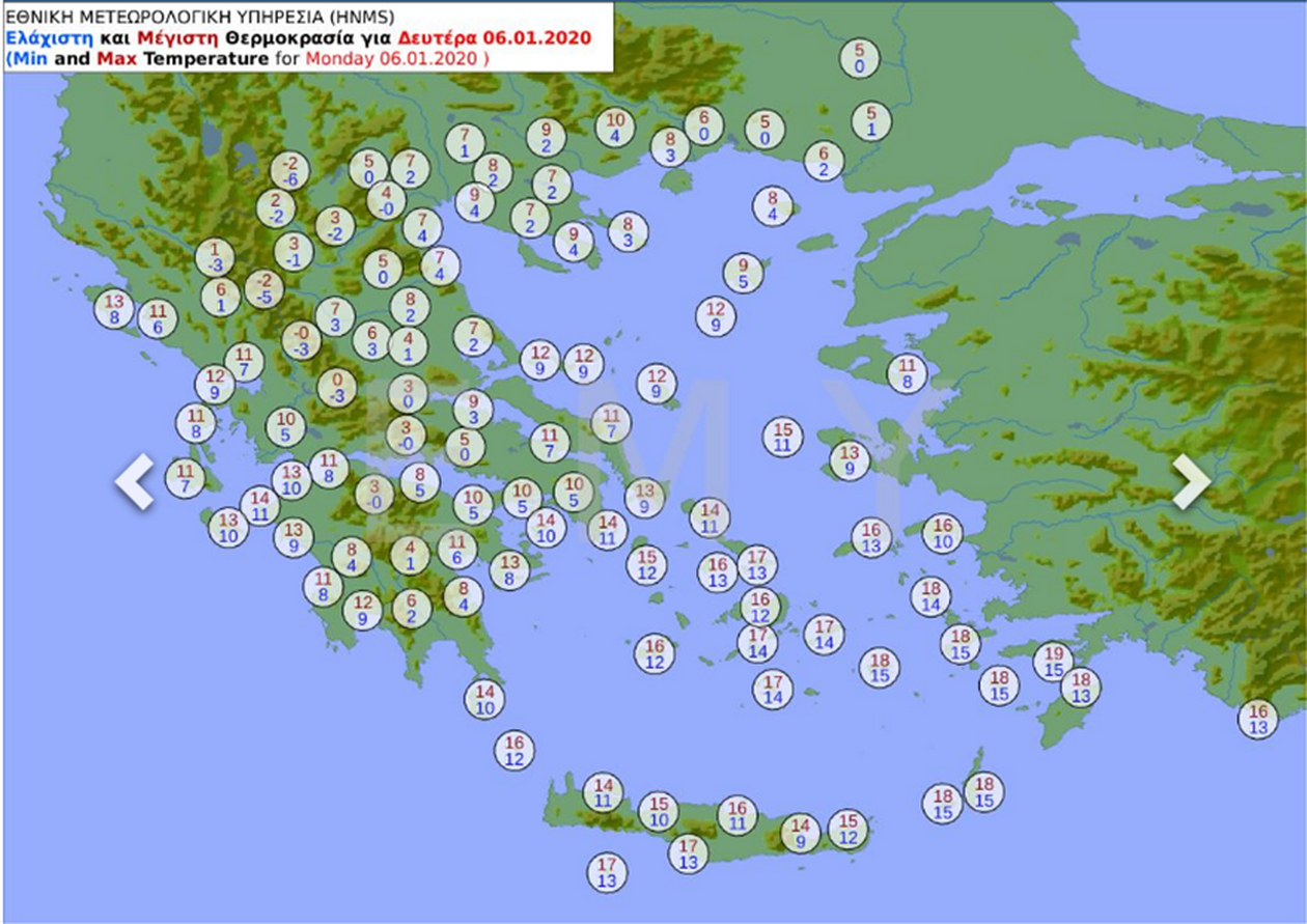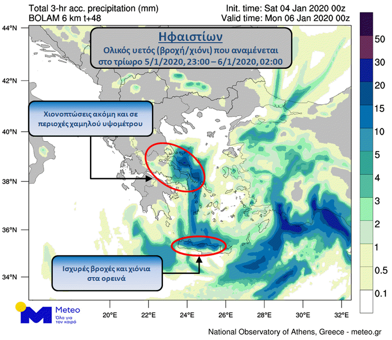 β. Τη Δευτέρα (Θεοφάνεια 06-01-2020), κατά τόπους πυκνές χιονοπτώσεις θα σημειωθούν στην ανατολική Στερεά και την Εύβοια και στα νησιά του βορείου και ανατολικού Αιγαίου (ενδεικτικό υψόμετρο 200-400 μέτρα και πιθανώς και σε πεδινές περιοχές), καθώς και στα ορεινά – ημιορεινά της Κρήτης.