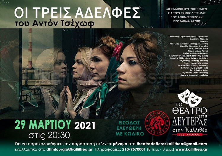 Στις 29 Μαρτίου και ώρα 20.30 η 7η διαδικτυακή παράσταση από το Δήμο Καλλιθέας από το πρόγραμμα του Θεάτρου της Δευτέρας στη Καλλιθέα «Οι Τρεις Αδελφές» του Αντόν Τσέχωφ, σε σκηνοθεσία Δημήτρη Τάρλοου,