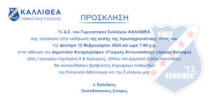 Η Κοπή πίτας του ιστορικού Γυμναστικού Συλλόγου Καλλιθέα θα πραγματοποιηθεί την Δευτέρα 12 Φεβρουαρίου 2024 στις 19.000 στο Δημοτικό Κινηματογράφο Γιώργος Αντωνακάκης (πρωην Καλυψώ) Παράλληλα με την κοπή θα πραγματοποιηθούν βραβεύσεις κορυφαίων αθλητών.