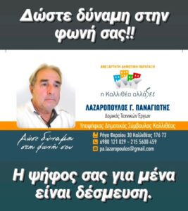 ” Δώστε δύναμη στην φωνή σας ” ολοι εσείς φίλοι μου Καλλιθεάτες και στις επικείμενες Δημοτικές εκλογές δώστε μου με την ψήφο σας την εντολή για να συμβάλλω κι εγώ με τις δυνάμεις μου να αλλάξουμε ακόμα περισσότερο την πόλη μας.