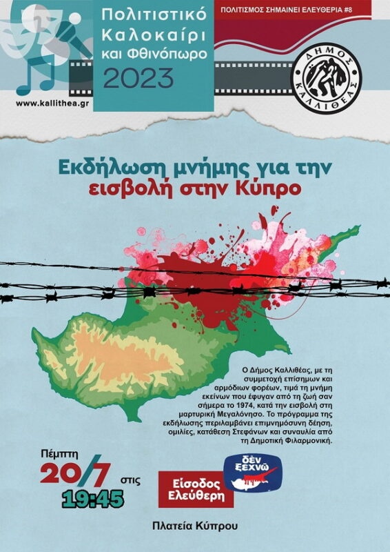 Την Πέμπτη 20 Ιουλίου 2023 στην πλατεία Κύπρου στις 19.45 . Ο Δήμος Καλλιθέας, με τη συμμετοχή επίσημων και αρμόδιων φορέων, τιμά τη μνήμη εκείνων που έφυγαν από τη ζωή σαν σήμερα το 1974, κατά την εισβολή στη μαρτυρική Μεγαλόνησο. Η εκδήλωση περιλαμβάνει επιμνημόσυνη δέηση, ομιλίες, κατάθεση Στεφάνων και συναυλία από τη Δημοτική Φιλαρμονική.