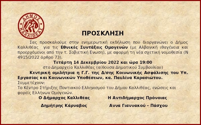 Ο Δήμος Καλλιθέας πραγματοποιεί την Τετάρτη 14 Δεκεμβρίου στις 19:00 στην αίθουσα του Δημοτικού Συμβουλίου Καλλιθέας ενημερωτική εκδήλωση με θέμα “Εθνικές Συντάξεις Ομογενών” ( με Αλβανική Ιθαγένεια και προερχόμενων από την Π. Σοβιετική Ένωση). Μια ενημερωτική εκδήλωση που έκρινε απαραίτητη να γίνει ο Δήμαρχος Καλλιθέας Δημήτρης Κάρναβος και η Αντιδήμαρχος Πρόνοιας Άννα Γιαννάκου Πάσχου με κεντρική ομιλήτρια την Γενική Γραμματέα Υπουργείου Εργασίας& Κοινωνικών Υποθέσεων Παυλίνα Καρασιώτου. Την συζήτηση θα συντονίζει η δημοσιογράφος Φραντζέσκα Σαββοργινάκη και θα συμμετέχουν το Κέντρο Στήριξης Ποντιακού Ελληνισμού ενώσεις και φορείς Ελλήνων Ομογενών.