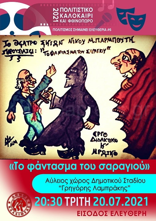 Σήμερα στις 20:30 στον Αύλειο χώρο του Δημοτικού Σταδίου “Γρηγόρης Λαμπράκης” το Θέατρο Σκιών του Νίκου Μπαρμπούτη θα παρουσιάσει την παράσταση «Το φάντασμα του σαραγιού» στα πλαίσια των εκδηλώσεων Πολιτιστικό Καλοκαίρι και Φθινόπωρο 2021 Δήμου Καλλιθέας