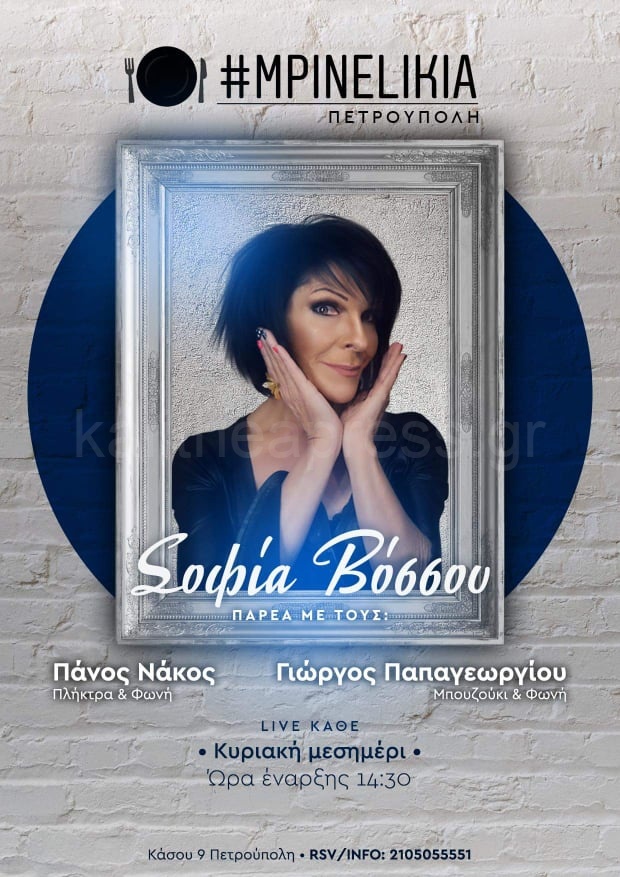 Η Σοφία Βόσσου , ερμηνεύτρια, συνθέτης, στιχουργός, καθηγήτρια μουσικής, πιο ανανεωμένη από ποτέ επιστρέφει στα μουσικά δρώμενα για να δώσει τον δικό της παλμό στην διασκέδαση.