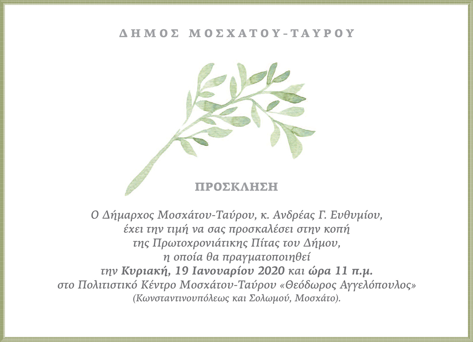 Tην Κυριακή 19 Ιανουαρίου 2020 και ώρα 11:00 π.μ. στο Πολιτιστικό Κέντρου του Δήμου Μοσχάτου-Ταύρου “Θεόδωρος Αγγελόπουλος” θα πραγματοποιηθει η κοπή πίτας του Δήμου.