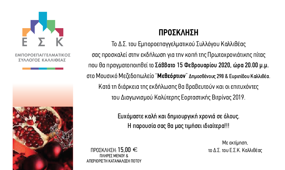 Σας προσκαλούμε στην εκδήλωση για την Κοπή της Πρωτοχρονιάτικης Πίτας μας , το Σάββατο 15 Φεβρουαρίου 2020 και ώρα 20.00μμ στο Μουσικό Μεζεδοπωλείο «Μεθεόρτιον» ,Δημοσθένους 298 & Ευριπίδου (δίπλα στο Ίδρυμα Σταύρος Νιάρχος) Σας ενημερώνουμε ότι στην εκδήλωση θα γίνει και η ανάδειξη και η απονομή βραβείων στους νικητές του Διαγωνισμού Καλύτερης Εορταστικής Βιτρίνας 2019.