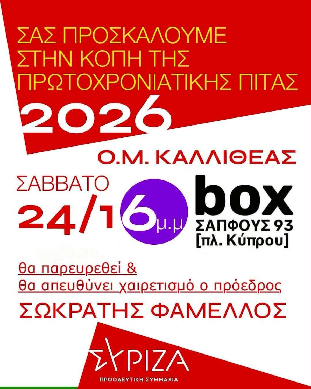 Την κοπή της πρωτοχρονιάτικης πίτας για το 2026 διοργανώνει η Οργάνωση Μελών Καλλιθέας, όπως γνωστοποιείται μέσω σχετικής αφίσας – πρόσκλησης που δόθηκε στη δημοσιότητα. Η εκδήλωση θα πραγματοποιηθεί το Σάββατο 24 Ιανουαρίου, στις 16:00, στον χώρο “box”, επί της οδού Σαπφούς 93, στην πλατεία Κύπρου.