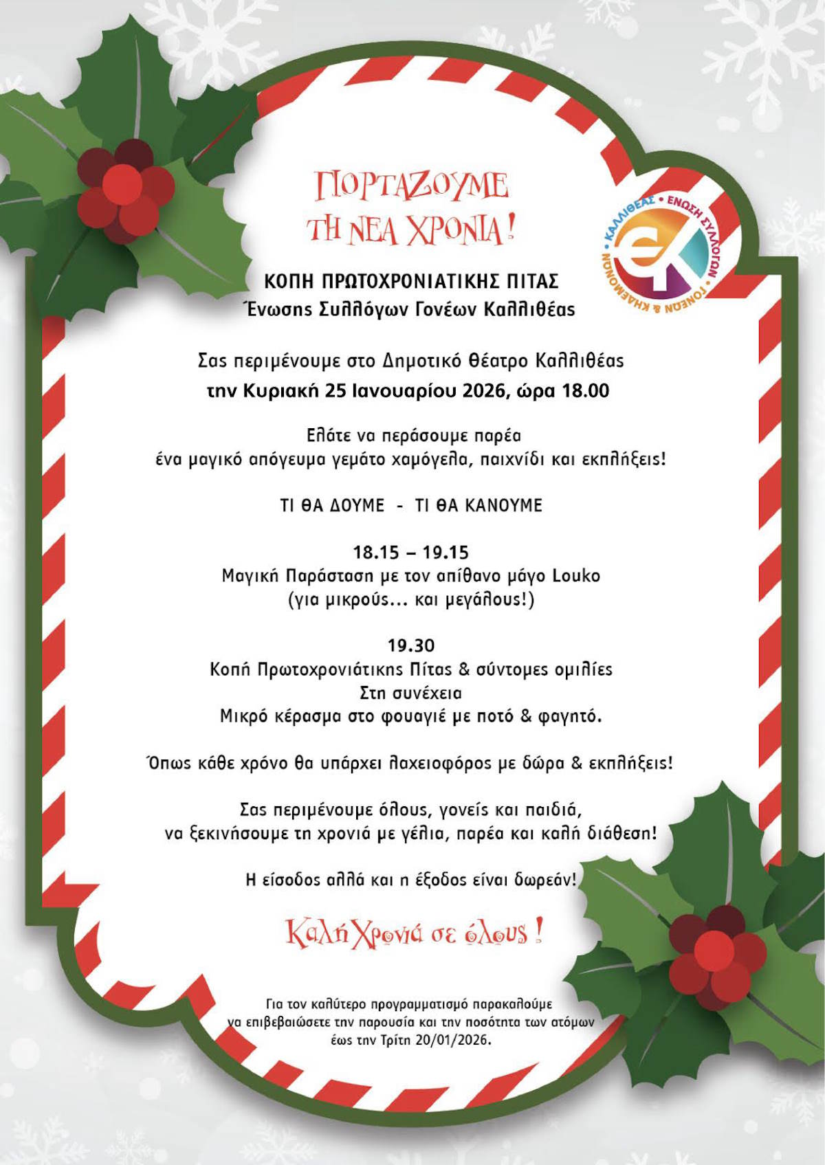 Σας περιμένουμε στο Δημοτικό θέατρο Καλλιθέας την Κυριακή 25 Ιανουαρίου 2026