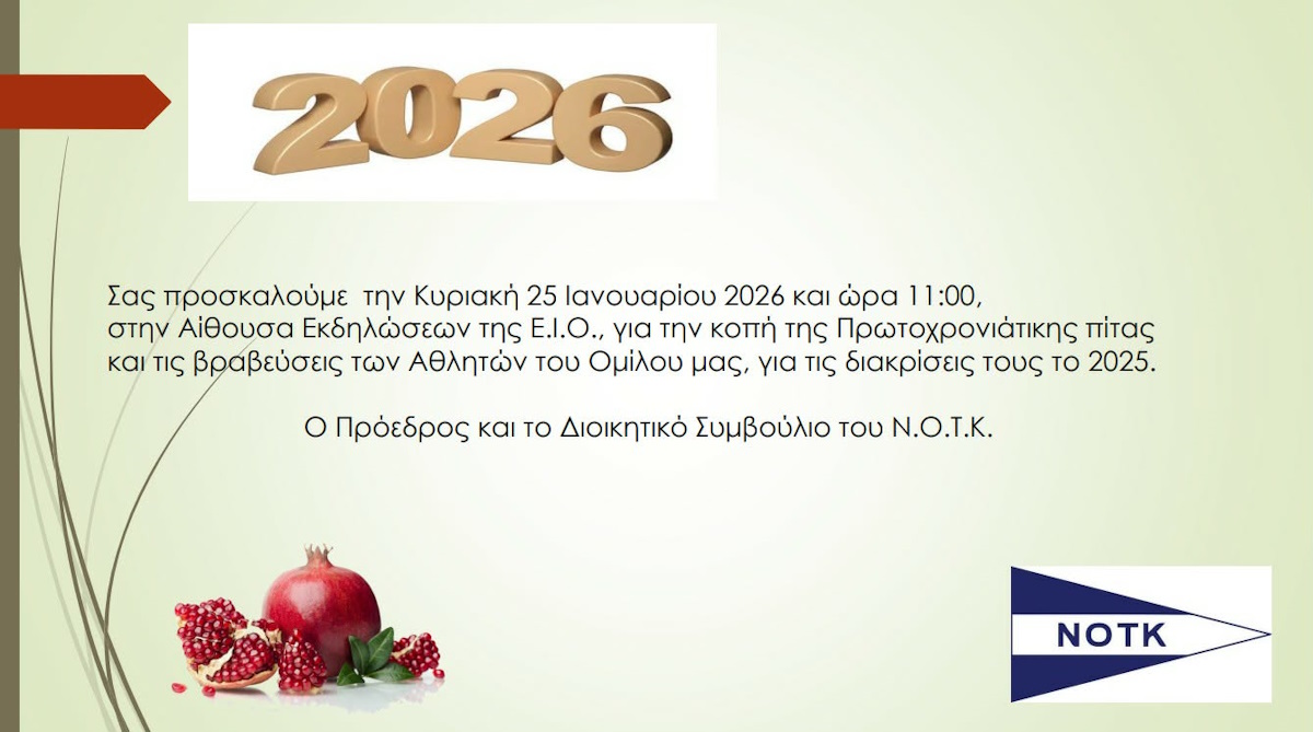 Την καθιερωμένη κοπή της πρωτοχρονιάτικης πίτας του θα πραγματοποιήσει ο Ναυταθλητικός Σύλλογος Τζιτζιφιών Καλλιθέας (ΝΟΤΚ) στη Ναυταθλητική Μαρίνα Καλλιθέας, στις 11:00. Η εκδήλωση αποτελεί μια όμορφη ευκαιρία συνάντησης για αθλητές, προπονητές, μέλη, φίλους και υποστηρικτές του συλλόγου, σε ένα ζεστό και εορταστικό κλίμα.