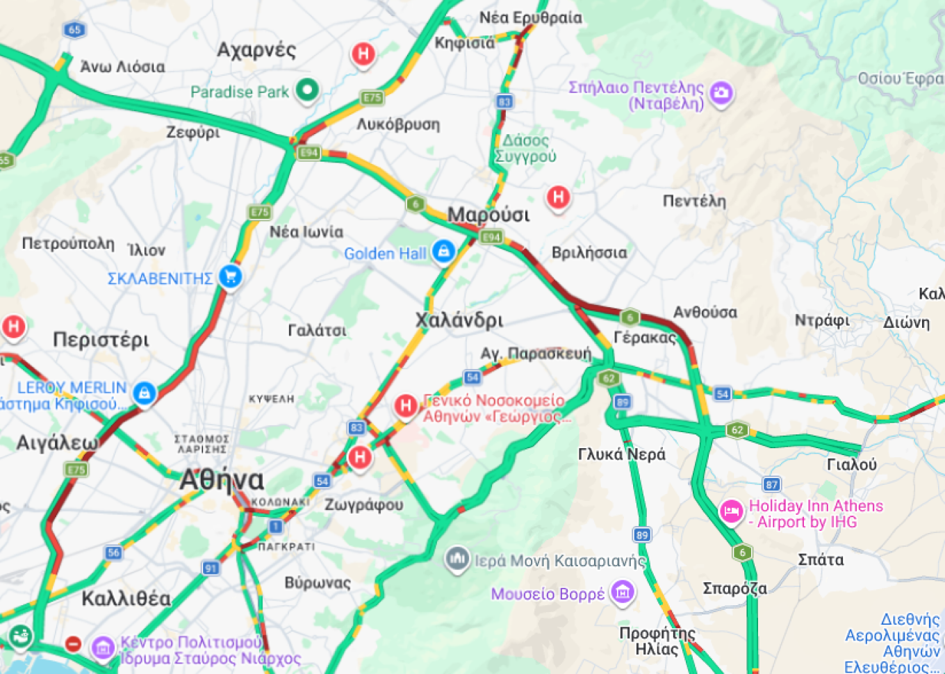 Λεωφόρος Κηφισίας και Μεσογείων: Πυκνή ροή κυκλοφορίας και μικρά μποτιλιαρίσματα, κυρίως σε ώρες αιχμής.
