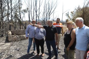 «Βρισκόμαστε εδώ σήμερα με τον Περιφερειάρχη Αττικής τον κύριο Πατούλη. Τα αντανακλαστικά της Περιφέρειας ήτανε άμεσα και κατά τη διάρκεια της πυρκαγιάς, αλλά και την επόμενη μέρα. Η Περιφέρεια είναι δίπλα μας, είχαμε μία εξαιρετική συνεργασία. Θεωρώ ότι ήδη κ. Περιφερειάρχα -και σας ευχαριστούμε πολύ για αυτό- βοηθήσατε υπέρ του δέοντος. Ανταποκριθήκατε και όλες αυτές τις μέρες ήσασταν και είστε παρών εδώ. Αυτό ήταν πολύ σημαντικό για τους κατοίκους της περιοχής. Τα κλιμάκια της Περιφέρειας βρίσκονται εδώ ήδη από τις 7:00 το πρωί και κάνουν καταγραφές για τις ζημιές που έχουν υποστεί οι κάτοικοι. Συνεχίζουμε, είμαστε δίπλα στους πολίτες, δίπλα στους δημότες, σε συνεργασία πάντα με την Περιφέρεια και νομίζω θα καταφέρουμε και έτσι θα πιέσουμε και το κράτος, την πολιτεία να προχωρήσει όσο γίνεται συντομότερα στις αποζημιώσεις. Σας ευχαριστούμε».