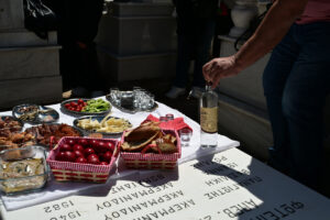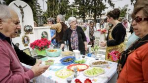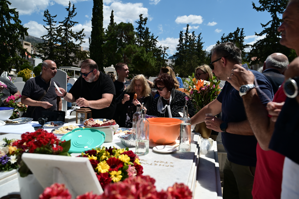 Μετά τη Θεία Λειτουργία, οι συγγενείς κατευθύνονται στα κοιμητήρια, όπου έχουν ήδη στρωθεί τραπεζομάντιλα πάνω στους τάφους. Εκεί τοποθετούνται παραδοσιακά εδέσματα όπως τσουρέκια, κόκκινα αυγά, μεζέδες και ποτά. Οι ιερείς τελούν τρισάγια, ενώ στη συνέχεια ακολουθεί μια ιδιαίτερη, ανθρώπινη στιγμή: οι οικογένειες παραμένουν δίπλα στους τάφους, μιλούν για τους δικούς τους ανθρώπους, θυμούνται ιστορίες και μοιράζονται στιγμές, σαν να βρίσκονται ακόμη μαζί τους.