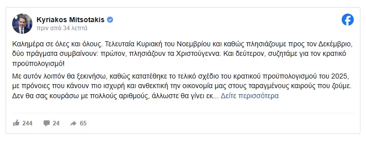 Την καθιερωμένη εβδομαδιαία του ανάρτηση έκανε το πρωί της Κυριακής ο πρωθυπουργός Κυριάκος Μηταοτάκης. Σε αυτή μεταξύ άλλων επισημαίνει ότι «κατατέθηκε το τελικό σχέδιο του κρατικού προϋπολογισμού του 2025, με πρόνοιες που κάνουν πιο ισχυρή και ανθεκτική την οικονομία μας στους ταραγμένους καιρούς που ζούμε[…] είναι ένας προϋπολογισμός με κοινωνικό πρόσημο, με τις μόνιμες, θετικές παρεμβάσεις για τους πολίτες και τις επιχειρήσεις να είναι αυξημένες κατά 1,1 δισ. ευρώ σε σχέση με τον προϋπολογισμό του 2024. Περιλαμβάνει 12 αυξήσεις αποδοχών και 12 μειώσεις φόρων, προβλέπει ανάπτυξη 2.3%[…]».