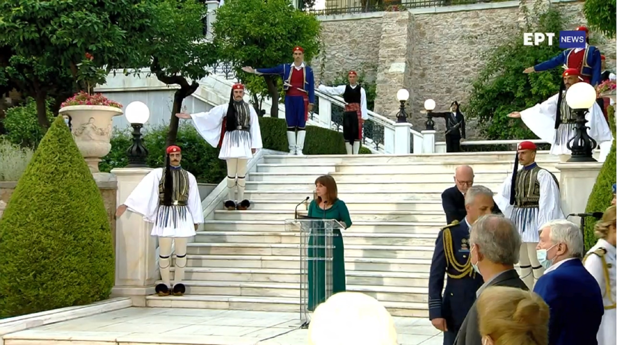 Στην ομιλία της η Πρόεδρος της Δημοκρατίας, Κατερίνα Σακελλαροπούλου, σημείωσε πως η επέτειος δεν γεμίζει μόνο με συναισθήματα χαράς και υπερηφάνειας, καθώς «η τραγωδία της Κύπρου παραμένει το πιο μεγάλο τραύμα του Ελληνισμού. Με αδελφική συνεργασία και ακλόνητη προσήλωση στη διεθνή νομιμότητα καταβάλλουμε κάθε δυνατή προσπάθεια για τη λύση του Κυπριακού, στη βάση των αποφάσεων του Συμβουλίου Ασφαλείας των Ηνωμένων Εθνών και του ευρωπαϊκού κεκτημένου. Η Ελλάδα δεν πρόκειται να δεχθεί τετελεσμένα και επεκτατικές ενέργειες. Καμία υποχώρηση δεν χωρεί στις απαράδεκτες εξαγγελίες της Τουρκίας για την περίκλειστη πόλη της Αμμοχώστου. Η συμπαράστασή μας στην Κύπρο είναι απόλυτη. Το ίδιο και η αποφασιστικότητά μας απέναντι στην τουρκική παραβατικότητα και επιθετικότητα».