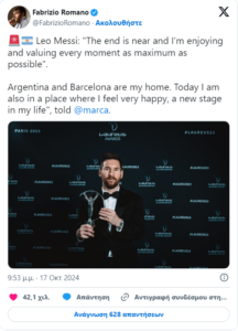 «Το τέλος είναι κοντά. Απολαμβάνω και αξιολογώ κάθε στιγμή στο μέγιστο και στο μέτρο του δυνατού. Σήμερα, είμαι σε ένα μέρος (Ίντερ Μαϊάμι) που αισθάνομαι χαρούμενος. Είναι ένα νέο στάδιο της ζωής μου», δήλωσε χαρακτηριστικά ο GOAT.