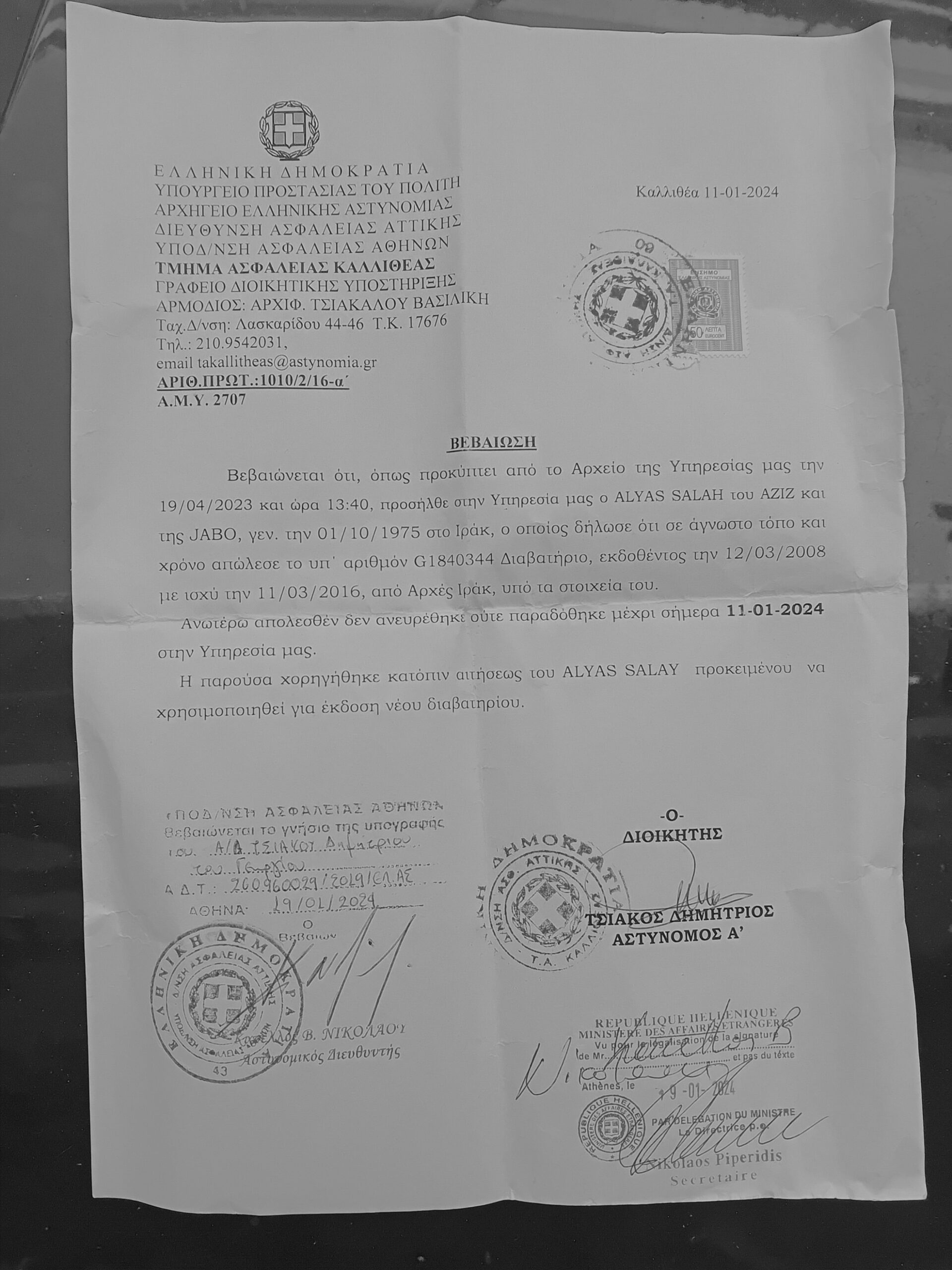Στις 13/04/2023 χάθηκε διαβατήριο στην Καλλιθέα από τον ALYAS SALAH του AZIZ και της JUBO. Μέχρι σήμερα δεν έχει ανευρεθεί. Παρακαλείται όποιος το έχει στην κατοχή του να το παραδώσει στο Τμήμα Ασφαλείας Καλλιθέας στην οδό Λασκαρίδου 44-46 η να καλέσει στο τηλέφωνο 210-9542031.