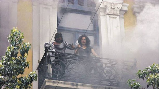 Τρεις από αυτούς σπάνε τις τζαμαρίες και πετούν μέσα στο υποκατάστημα βόμβες μολότοφ. Το κτίριο τυλιγεται γρήγορα στις φλόγες.