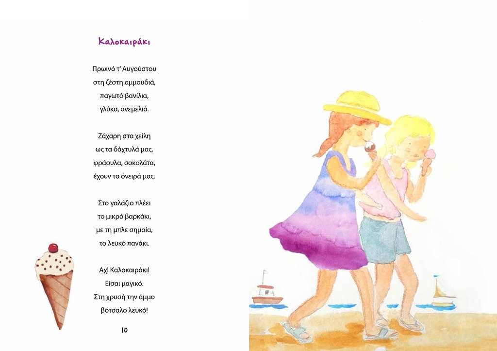 -Το βιβλίο αυτό έχει μια ιδιαιτερότητα. Ξεκίνησε σαν ένα παιχνίδι ανάμεσα σε μένα και την εικονογράφο η οποία μού έστελνε ακουαρέλες με καλοκαιρινές εικόνες εμπνευσμένες από τα δικά μας παιδικά καλοκαίρια… Με βάση αυτές τις ζωγραφιές, πλημμυρισμένες με όνειρα στην άμμο, φορώντας πάλι το ψάθινο καπέλο μου και κρατώντας ένα παγωτό ξυλάκι, συντροφιά με τη φίλη μου στο λιμανάκι, έγραψα τους στίχους αναβιώνοντας όμορφες στιγμές. Είναι αφιερωμένο στα παιδιά και σε όσους αγαπούν και χαίρονται το καλοκαίρι σαν παιδιά! Η ανεμελιά του καλοκαιριού ανήκει σε όλους.