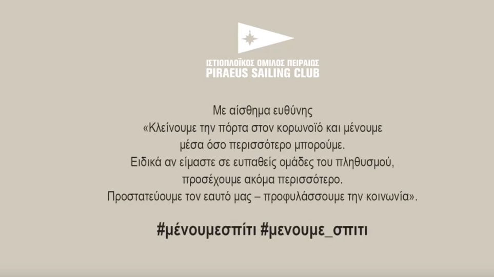 Ο Ιστιοπλοικός Ομιλος Πειραιά στα πλαίσια των πρωτοβουλιών έβγαλε τα συγκεκριμένα βίντεο με τους ιστιοπλόους του να αναφέρουν ”ΜΕΝΟΥΜΕ ΣΠΙΤΙ”