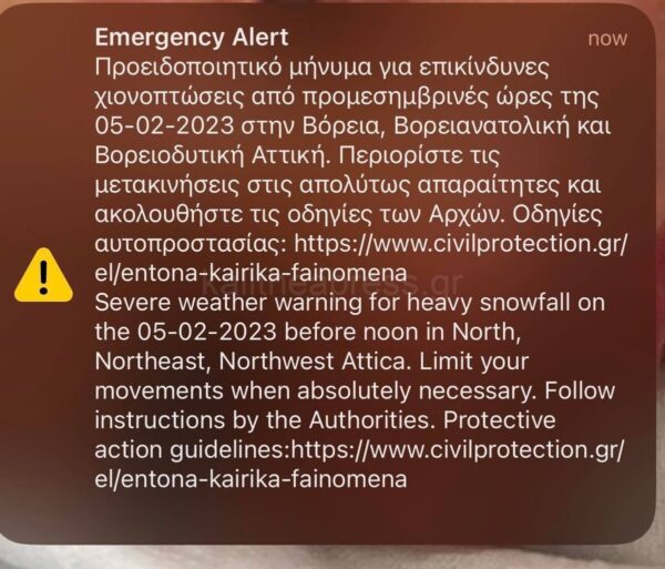 Το μήνυμα προειδοποιεί για επικίνδυνες χιονοπτώσεις από τις προμεσημβρινές ώρες της Κυριακής (05/02/2023) στην Βόρεια, Βορειοανατολική και βορειοδυτική Αττική και συνιστά στους πολίτες να περιορίσουν τις μετακινήσεις τους στις απολύτως απαραίτητες.