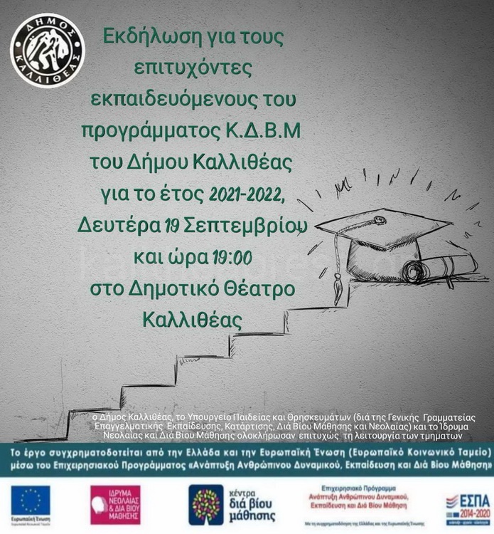 Ο Δήμος Καλλιθέας διοργανώνει εκδήλωση τη Δευτέρα 19/9/2022 και ώρα 19.00 για την απονομή των βεβαιώσεων παρακολούθησης εκπαιδευομένων των τμημάτων που υλοποιήθηκαν στο Κέντρο Δια Βίου Μάθησης του Δήμου Καλλιθέας κατά το εκπαιδευτικό έτος 2021-2022 στο πλαίσιο του συγχρηματοδοτούμενου Έργου «Κέντρα Διά Βίου Μάθησης (Κ.Δ.Β.Μ.)-Νέα Φάση» (ΟΠΣ 5002212). Η εκδήλωση θα πραγματοποιηθεί στο Δημοτικό Θέατρο Καλλιθέας, που βρίσκεται επί των οδών Κρέμου 123 και Φιλαρέτου. Θα ήταν ιδιαίτερη χαρά και τιμή μας να παρευρεθείτε.