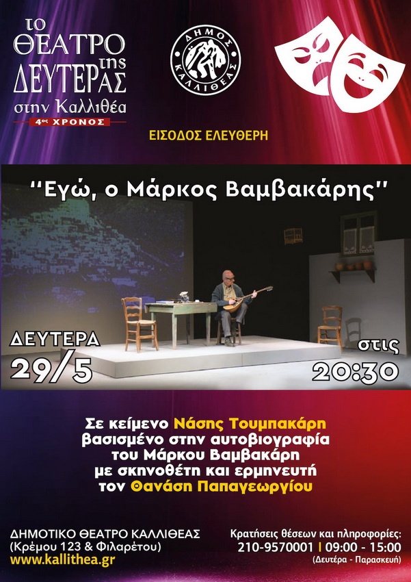 Το Θέατρο της Δευτέρας “ΛΑΖΑΡΟΣ ΛΑΣΚΑΡΙΔΗΣ” συνεχίζει την Δευτέρα 29 Μαΐου τις παραστάσεις στο ΔΗΜΟΤΙΚΟ ΘΕΑΤΡΟ ΚΑΛΛΙΘΕΑΣ(Κρέμου 123 & Φιλαρέτου) με το έργο της Νάσης Τουμπακάρη «Εγώ ο Μάρκος Βαμβακάρης» που σκηνοθέτησε και ερμηνεύει ο Θανάσης Παπαγεωργίου. Το έργο που παρουσιάζεται εκ νέου από τον Νοέμβριο, είναι μια μεγάλη επιτυχία της Στοάς αλλά και του ίδιου του σκηνοθέτη και ερμηνευτή είναι βασισμένο στην αυτοβιογραφία του Μάρκου Βαμβακάρη με σκηνοθέτη και ερμηνευτή τον Θανάση Παπαγεωργίου.