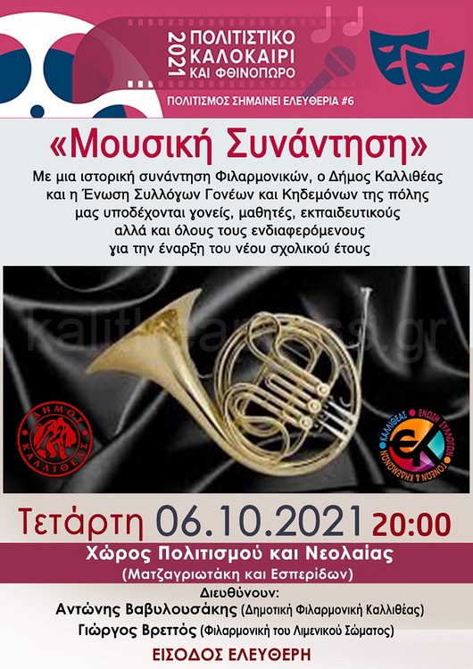 Στα πλαίσια των εκδηλώσεων του Δήμου Καλλιθέας Πολιτιστικό Καλοκαίρι και Φθινόπωρο 2021. Πραγματοποιείται στις 20:00 την Τετάρτη 6 Οκτωβρίου στον Χώρο Πολιτισμού και Νεολαίας (Ματζαγριωτάκη – Εσπερίδων) η «Μουσική Συνάντηση» μια ιστορική συνάντηση Φιλαρμονικών, ο Δήμος Καλλιθέας και η Ένωση Συλλόγων Γονέων και Κηδεμόνων της πόλης μας υποδέχονται γονείς, μαθητές, εκπαιδευτικούς αλλά και όλους τους ενδιαφερόμενους για την έναρξη του νέου σχολικού έτους. Θα συνυπάρξουν επί σκηνής η Φιλαρμονική του Λιμενικού Σώματος, υπό τη διεύθυνση του αρχιμουσικού Γιώργου Βρεττού και η Δημοτική Φιλαρμονική Καλλιθέας, υπό τη διεύθυνση του αρχιμουσικού Αντώνη Βαβυλουσάκη.