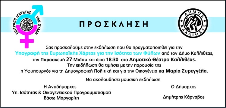 Την Παρασκευή 27 Μαΐου στις 18:30 στο Δημοτικό Θέατρο Καλλιθέας, θα πραγματοποιηθεί ανοιχτή εκδήλωση με αφορμή την Υπογραφή της Ευρωπαϊκής Χάρτας για την Ισότητα των Φύλων από το Δήμο Καλλιθέας.