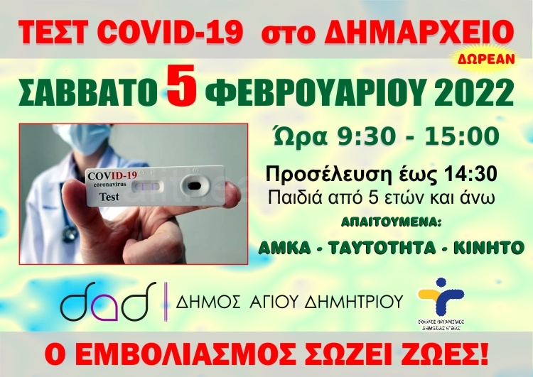 Συνεχίζονται τα τεστ ανίχνευσης κρουσμάτων κορωνοϊού το Σάββατο 5 Φεβρουαρίου 2022 και από τις 9:30 έως 15:00 (προσέλευση έως 14:30) από κινητή μονάδα του ΕΟΔΥ που θα βρίσκεται έξω από το Δημαρχείο Αγίου Δημητρίου (Αγίου Δημητρίου 55).