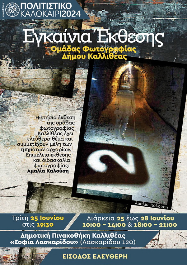 Την ΤΡΙΤΗ 25 ΙΟΥΝΙΟΥ 2024 στις 19:30 Εγκαίνια έκθεσης Ομάδας Φωτογραφίας Δήμου Καλλιθέας Δημοτική Πινακοθήκη «Σοφία Λασκαρίδου» (Λασκαρίδου 120)