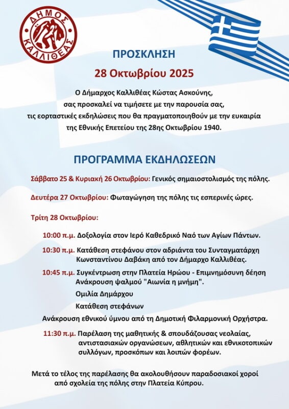 Η Καλλιθέα ετοιμάζεται να τιμήσει και φέτος την Εθνική Επέτειο της 28ης Οκτωβρίου 1940, με ένα πλούσιο πρόγραμμα εκδηλώσεων που συνδυάζει σεβασμό στην ιστορία, πολιτισμό και παραδοσιακές εκφράσεις της πόλης.