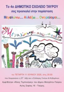 - 19:00, Αμφιθέατρο «Νίκος Τεμπονέρας» (Ταύρος – Αγίας Σοφίας 16): Το 4ο Δημοτικό Σχολείο Ταύρου παρουσιάζει τη θεατρική παράσταση «Μεγαλώνω, Αλλάζω, Ονειρεύομαι».