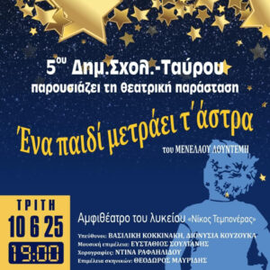 - 20:00, Αμφιθέατρο «Νίκος Τεμπονέρας» (Ταύρος – Αγίας Σοφίας 16): Το 5ο Δημοτικό Σχολείο μας ταξιδεύει με τη θεατρική παράσταση «Ένα παιδί μετράει τ΄ άστρα» του Μενέλαου Λουντέμη.